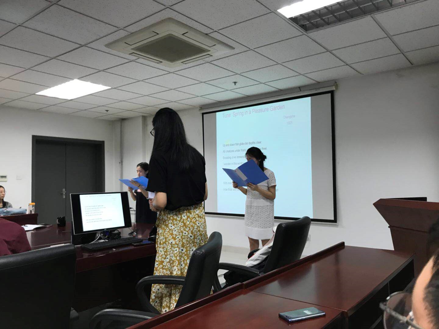 第一个环节是毛泽东经典诗歌双语朗诵。第一首是表达了毛泽东的博大情怀和革命的豪情壮志的《沁园春 长沙》,两位同学声情并茂地朗诵,让大家犹如亲身感受到了绚丽多彩的湘江秋景。第二首选择的是铁血长征中征战娄山关时毛主席写下的《忆秦娥 娄山关》,两位同学将“慷慨悲烈、雄沉壮阔”的特点表现的淋漓尽致。接下来大家有选择了十分具有特色的《卜算子 咏梅》、《水调歌头 游泳》、《七律·人民解放军占领南京》。毛泽东诗歌的经典再加上外文翻译的韵味,让大家深深地沉浸在诗歌文化之中。