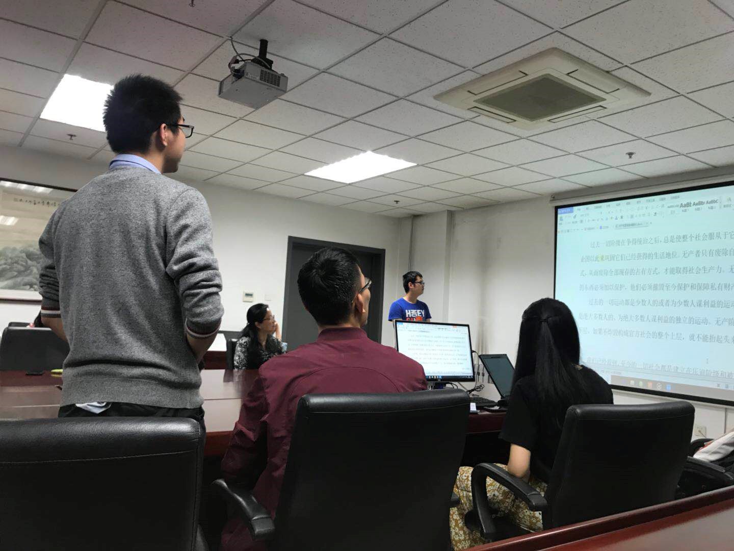 第二个环节是外语院党支部组织委员带领大家学习讨论共产党宣言,旨在陶冶情操,提高大家思想觉悟。大家阅读共产党宣言并分析当时政治局势,在新时代背景下,运用辩证唯物主义和历史唯物主义分析生产力与生产关系、经济基础与上层建筑的矛盾,分析阶级和阶级斗争。在讨论过程中硕7016党支部寇聪聪、王俊伟积极参与,和大家共同探讨生产力和生产关系的问题。