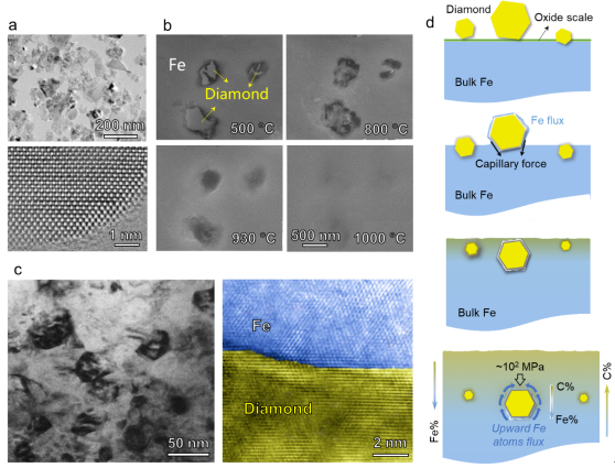 为验证这一大胆设想,研究团队以金刚石纳米颗粒和高纯铁及低碳钢为对象(图1a, b),利用原位透射电子显微镜对加热过程中金刚石纳米颗粒的运动过程进行实时观察:当表面附着有金刚石颗粒的钢铁被加热到一定温度后,其表面氧化膜首先发生分解,暴露出新鲜的铁原子。然后这些铁原子迅速向上扩散覆盖金刚石颗粒的表面,金刚石颗粒在毛细应力驱动下被快速“吞没”进钢铁基底中。冷却至室温后观察发现:金刚石颗粒不仅能够大量进入到钢铁内部(图1c),并且沉入深度可达到纳米金刚石颗粒自身尺寸的数千倍以上(毫米级)。图1d示意了整个进入过程。结合第一性原理计算、蒙特卡洛模拟及多维度表征,进一步揭示了纳米金刚石颗粒在钢铁晶体内部运动的微观机制:在铁的催化作用下,金刚石颗粒表面发生石墨化并部分溶解,在钢铁基底中及纳米金刚石颗粒周围分别形成长程和局部的碳浓度暨化学势梯度。在与此伴生的铁化学势梯度驱动下,金刚石周围的铁沿着金刚石和铁基底的界面不断上涌并形成一个向下局部应力,“推动”着金刚石向下前进。铁原子在金刚石颗粒表面的石墨层内的界面扩散,恰好为其远程迁移提供了快速通道(铁原子沿此通道向上迁移的速率得以高于铁晶格中碳原子向下运动的速率)。